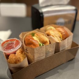 Came here around lunchtime and it was still poppin! I've had the simpler egg sandwiches from Eggslut before but this was the first time I got to try the more "lunch style" ones! My boyfriend and I had the following: - Gaucho (boyfriend got it and it was savory and tender) - Cheeseburger with Bacon (I got this and it was absolutely flavorful with a good level of umami) - Truffle Hashbrowns (we shared these and the hashbrowns were soooo good! Not too heavy and tasted nice and crisp) Despite a sort of long wait time in line, waiting for the food wasn't bad! Location is in one of the busier levels of the Cosmo, so expect a lot of noise and limited seating. It's a high energy space with yummy food!